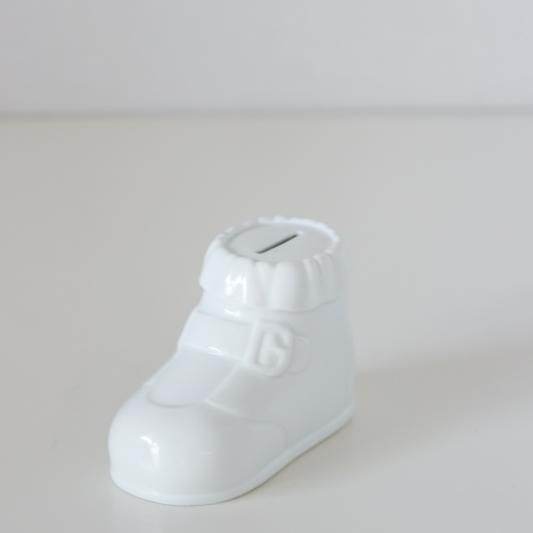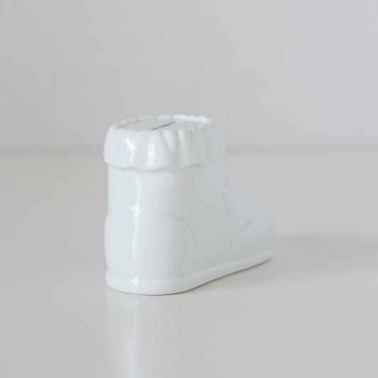 大きさもベビーシューズとほぼ同じぐらいのかわいらしいベビーシューズの形をしたコインバンク(貯金箱)です。