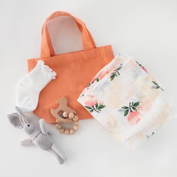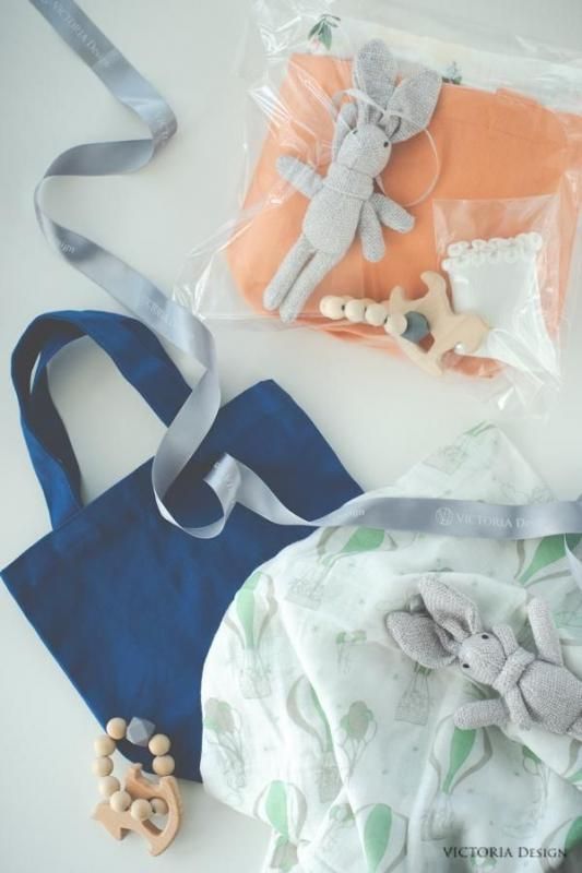 おくるみ、うさぎのぬいぐるみ、木のおもちゃ、靴下、バッグ 各1個